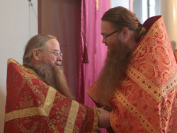 Его Высокопреподобию сослужили: заместитель председателя Синодального отдела по монастырям и монашеству архимандрит Стефан (Тараканов); протоиерей Александр Троицкий, клирик Патриаршего подворья при храмах бывшего Андреевского монастыря; братия монастыря в священном сане.