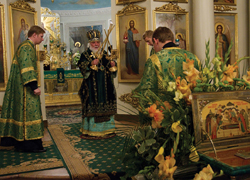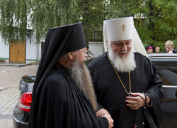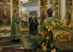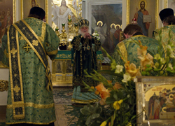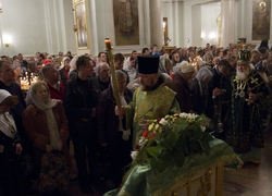 За всенощным бдением Его Высокопреосвященству сослужили наместник Даниловой обители архимандрит Алексий (Поликарпов) с братией монастыря в священном сане.