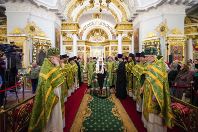 Перед началом богослужения у входа в собор Святейшего Владыку встречали: секретарь Патриарха Московского и всея Руси по г. Москве протопресвитер Владимир Диваков; благочинный Данилова монастыря архимандрит Лука (Пинаев); руководитель Департамента национальной политики и межрегиональных связей г. Москвы В.И. Сучков.
