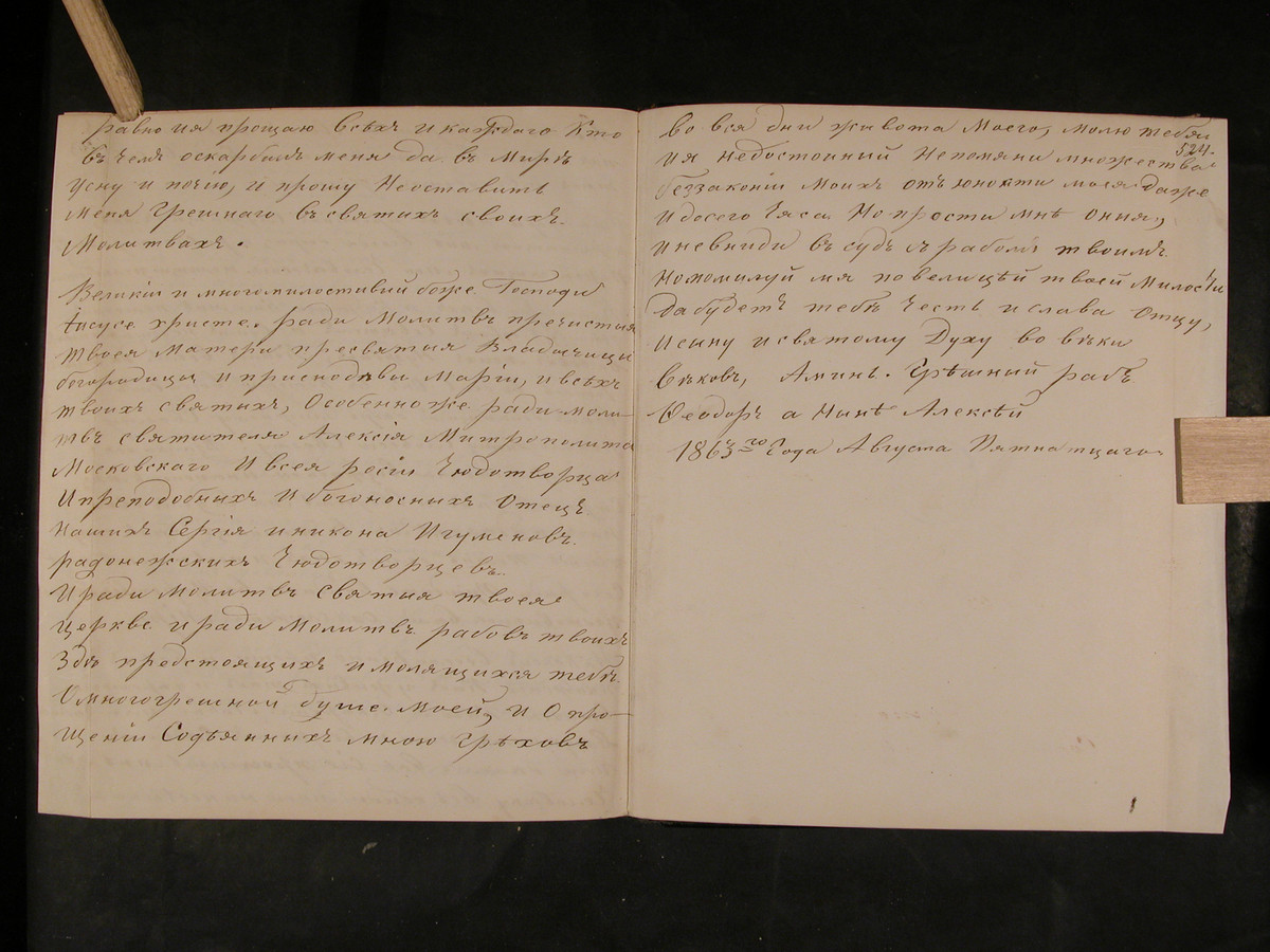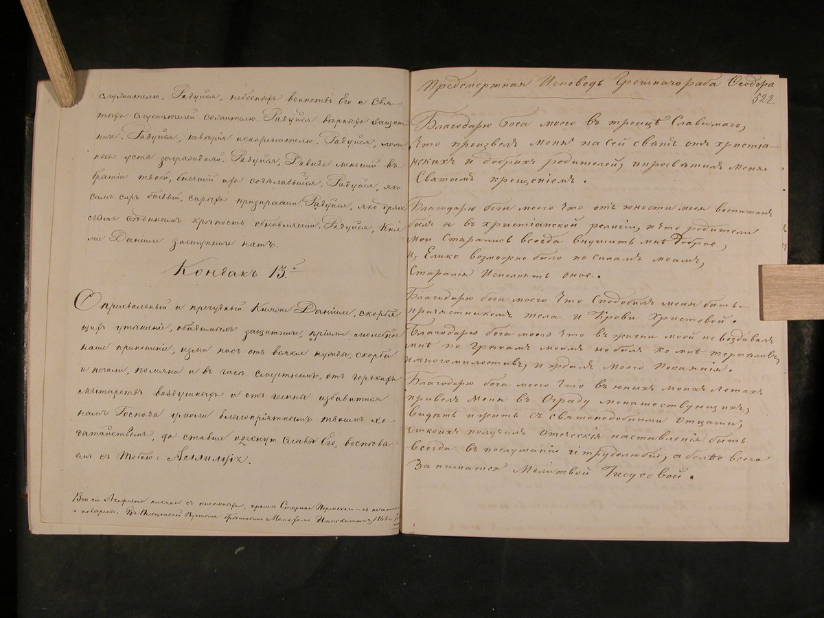 В конце одного из акафистников нашел акафист святому благоверному князю Даниилу Московскому с подписью в окончании: «Все сии акафисты писаны с писанных, кроме Стефана Пермского – с печатного, и поверены. В Площанской пустыни грешным монахом Иннокентием 1868 г. 7 марта». В конце – «Предсмертная исповедь грешного раба Феодора» – писца основной части рукописи. Список. В конце воспроизведены подпись и дата: «Грешный раб Феодор, а ныне Алексей. 1863-го года августа пятница 20» [3].