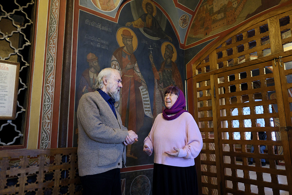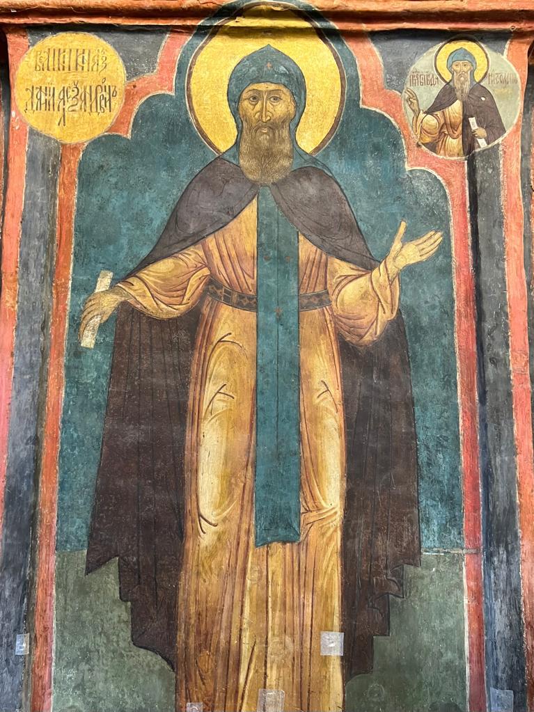 Александр Лавданский замечает, что росписи левой стены очень сильно потемнели от копоти. Я рассказала иконописцу о тех работах, которые велись в монастыре в 2025 году. Это и капитальное переустройство лестничных всходов крыльца храма Святых Отцов Семи Вселенских Соборов, и замена ступеней и основания у раки с частицами мощей святого благоверного князя Даниила, и фрагментарная реставрация росписей северного придела. Выразила надежду, что к юбилейной дате основателя Данилова монастыря – 725-летию со дня упокоения (2028 год) росписи придела князя Даниила будут полностью отреставрированы и вновь засияют первозданными красками. Ведь именно Данилов монастырь обладает уникальным образцом церковного искусства, как в плане иконографии, так и в плане фресковой техники.